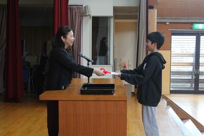 そして、町内の1年生に贈られる、「ひろすけ童話セット」の贈呈が行われ、1年生の代表児童が受け取りました。