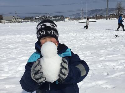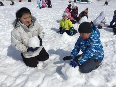 朝はガチガチの雪でしたが、中間タイムにはいい感じに柔らかくなり、いろんな形やサイズの雪だるまができていました。