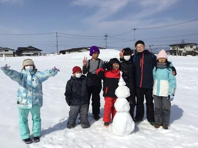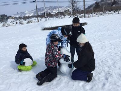 雪がたっぷりのグラウンドで縦割り班ごとに《雪だるま》を作ろうという企画です。