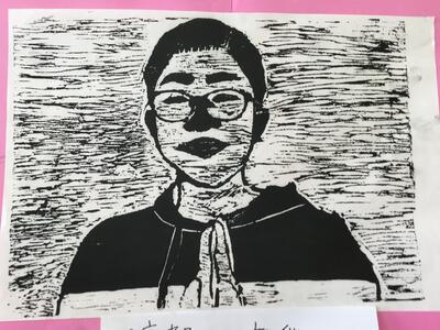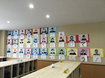 今朝は、6年生の自画像版画が感謝の言葉と共に、全校生を出迎えてくれました。