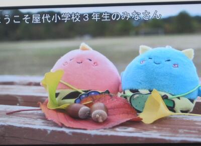 町のマスコット「たかっき」と「はたっき」が屋代小の3年生を出迎えてくれました。