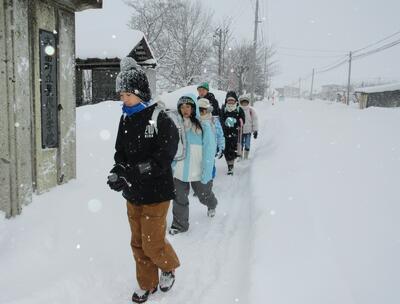 朝、歩きにくい冬道を、高学年を先頭にゆっくり歩いてくる屋代っ子。