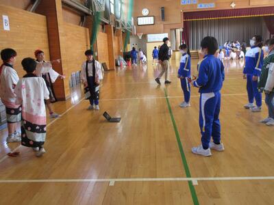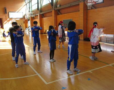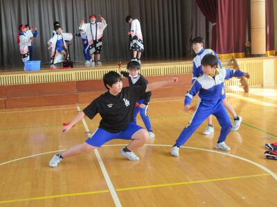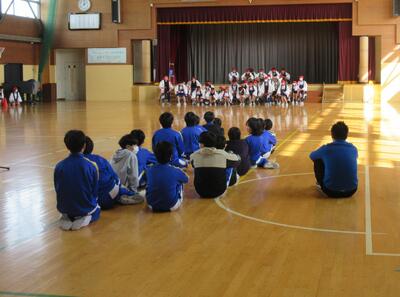 5・6年生が体育館に集合し、最初に6年生の踊りを5年生が見学しました。