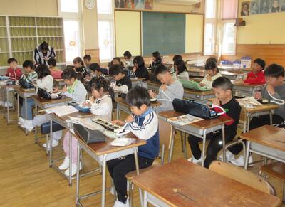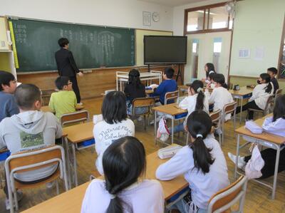 4年1組。外国語です。アルファベットの書き方を学んでいます。